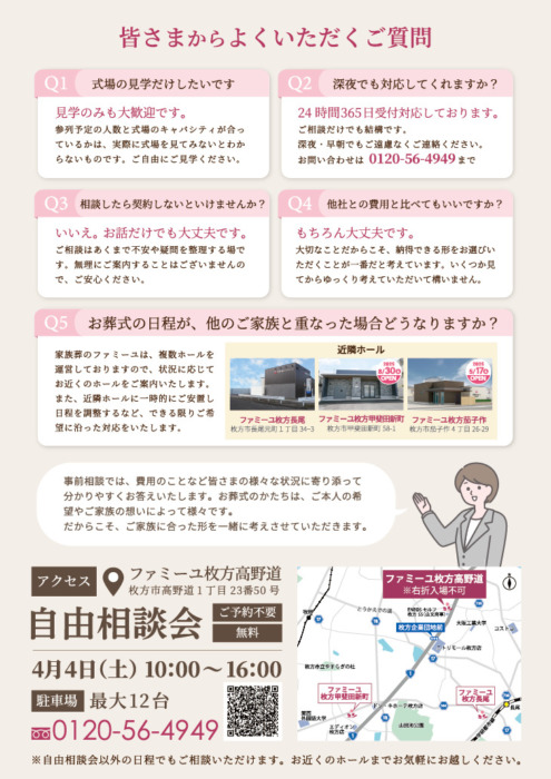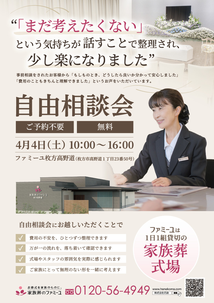 家族葬のファミーユ 枚方高野道ホールにて、どなたでもご自由にご参加いただける「相談会」を開催いたします。