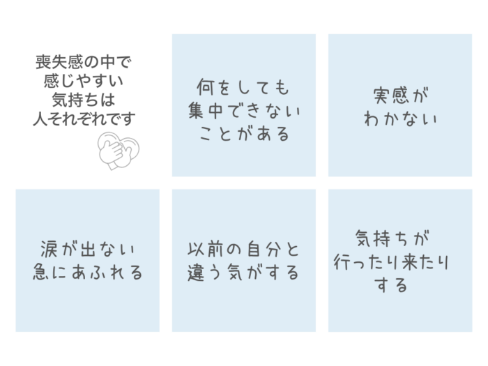 こうした状態も、決して珍しいものではありません。悲しみの感じ方や表れ方は、人それぞれなのです。