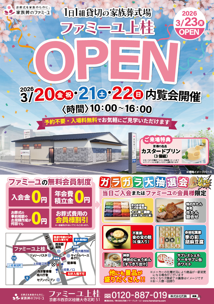 2026年3月23日(月)に、西京区初出店となる、「家族葬のファミーユ上桂ホール」がオープンいたします。