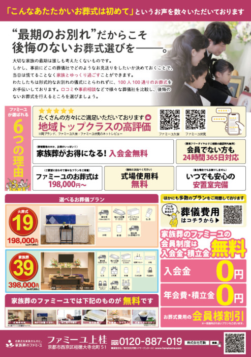 この機会にぜひ「1日1組貸切」の家族葬ホール、 ファミーユ上桂へお立ち寄りください。