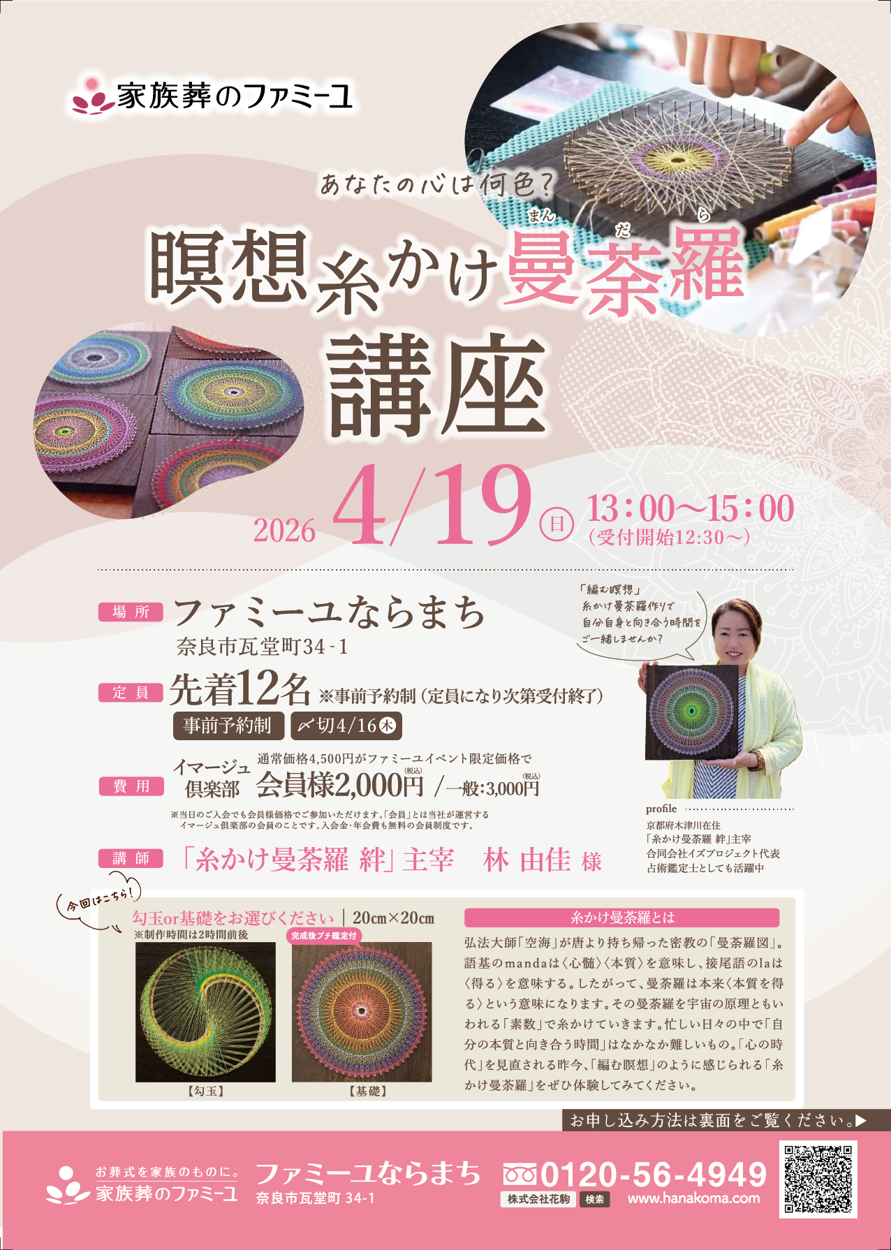 ファミーユならまちにて、【瞑想糸かけ曼荼羅(まんだら)講座】を開催いたします。