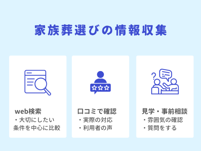 以上、家族葬の情報を収集しようとしたときに感じる迷いや困惑の気持ちを整理するためのポイントをお伝えしました。